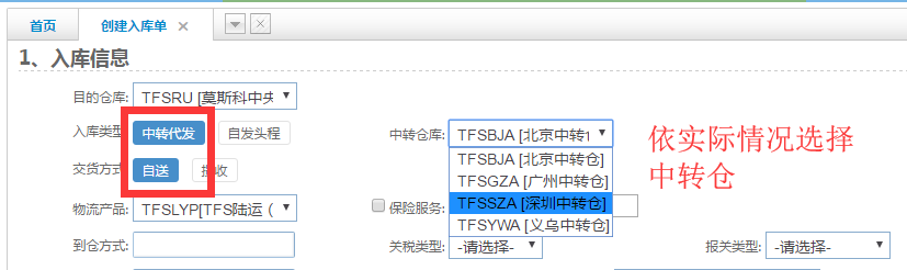 2.入庫(kù)單制作界面填寫下列信息(因攬收選項(xiàng)地址未維護(hù),派送方式選【自送】,不影響上門取貨)