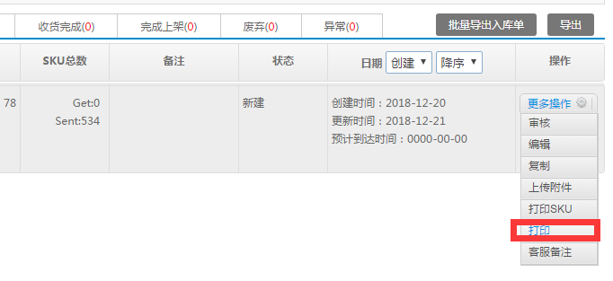 6.在【倉(cāng)配管理】中的【入庫(kù)單管理】界面搜索入庫(kù)單信息,打印入庫(kù)清單和箱單
