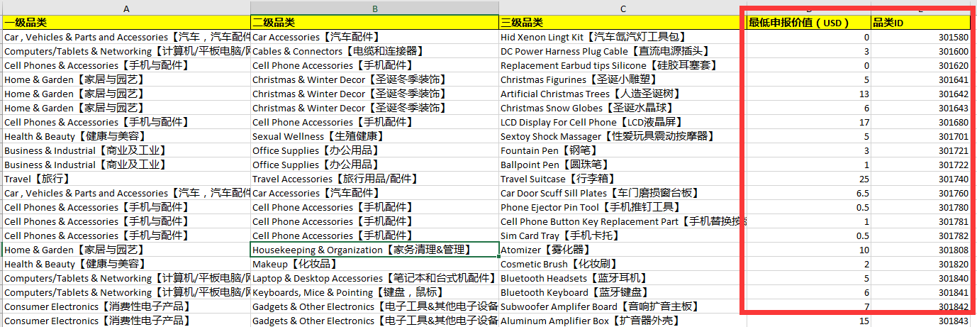 5.下圖為【基礎(chǔ)數(shù)據(jù)】中信息,紅框內(nèi)是【最低申報(bào)價(jià)值】和【品類ID】對(duì)應(yīng)的信息