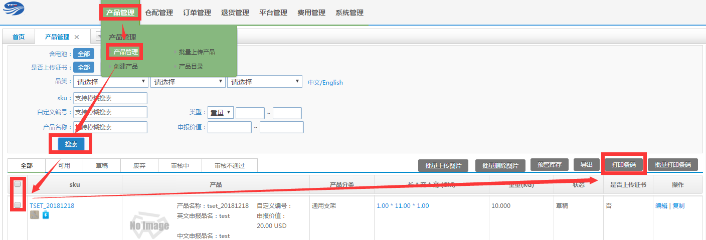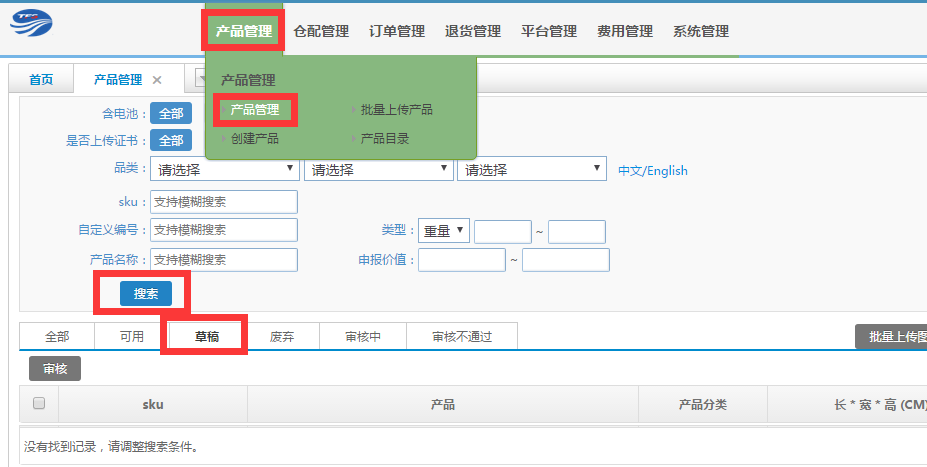 7.上傳成功后在【產(chǎn)品管理】中【搜索】查詢產(chǎn)品信息,點(diǎn)擊【草稿】查看新導(dǎo)入貨品信息,檢查無(wú)誤后勾選信息,點(diǎn)擊【審核】